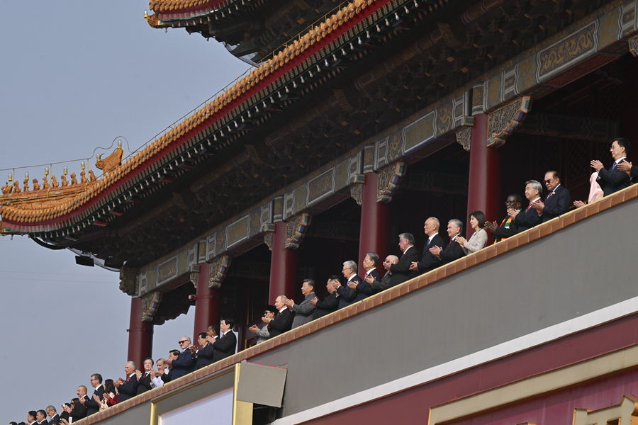 9月3日,纪念中国人民抗日战争暨世界反法西斯战争胜利80周年大会在北京天安门广场隆重举行。这是大会开始前,中共中央总书记、国家主席、中央军委主席日本女优 同出席大会的外方代表团团长前往天安门城楼。新华社记者 申宏 摄