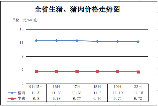 一、猪肉价格小幅下降。近期国内猪肉价格持续低迷,养殖端生猪存栏量多,且业内对猪肉价格后市看空,养殖户二次育肥少,出栏意愿强,导致市场供应极为充足。需求端猪肉替代品挤压市场,猪肉消费不旺,加上本周中央储备冻猪肉启动轮换出库工作,短期对市场供应有冲击,猪肉价格随之小幅下降。9月22日,生猪(每500克,下同)平均价格6.72元,周环比下降1.18%,同比下降29.85%;猪肉(去骨后腿肉)11.15元,周环比下降1.41%,同比下降24.46%。