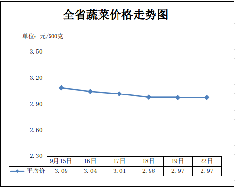 三、蔬菜价格小幅下降。近期天气晴好,利于本地蔬菜的生长和外地蔬菜的转运,加上凉爽的天气为蔬菜存储提供了极大便利,菜品变质减少,进一步拉低了销售成本,蔬菜市场价格随之小幅下降。9月22日,重点监测的16种蔬菜平均价格为2.97元,周环比下降3.65%,同比下降22.1%。