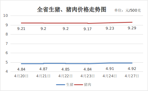 一、猪肉价格低位调整。当前集团企业生猪产能持续释放,市场供应压力仍存,但随着气温回升,居民外出活动增加,叠加“五一”节前备货,带动一部分猪肉消费需求提升,拉动生猪、猪肉价格微幅上涨。4月27日,生猪(每500克,下同)平均价格4.92元,周环比上涨1.65%,同比下降34.14%;猪肉(去骨后腿肉)9.29元,周环比上涨0.87%,同比下降20.73%。