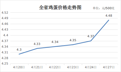 二、鸡蛋价格小幅上涨。随着“五一”节前备货陆续启动,贸易商采购量增加,加速鸡蛋走货,推动蛋价上行,此外,受前期蛋价持续上涨影响,养殖端惜售心理增强,进一步助推蛋价走高。4月27日,鸡蛋平均价格4.48元,周环比上涨4.19%,同比上涨8.21%。