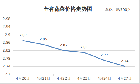 三、蔬菜价格小幅下降。本周气候适宜,蔬菜进入集中采收期,整体供应量增大,加之南方冬春茬蔬菜陆续收尾清园,低价北运,导致全省蔬菜价格持续走低。4月27日,重点监测的16种蔬菜平均价格为2.74元,周环比下降4.55%,同比下降5.05%。